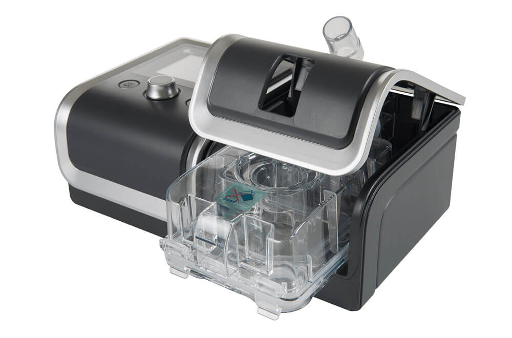 ☑️ رطيب بدون ماء (Waterless Humidification): يلغي الجهاز الحاجة إلى حجرة ماء تقليدية، ويستخدم بدلاً من ذلك تقنية مبادلات الرطوبة (Moisture Exchangers – HU/HU-Plus). هذا يحل مشكلة التكثف وتسرب الماء أثناء السفر، ويسهل العملية بشكل كبير.